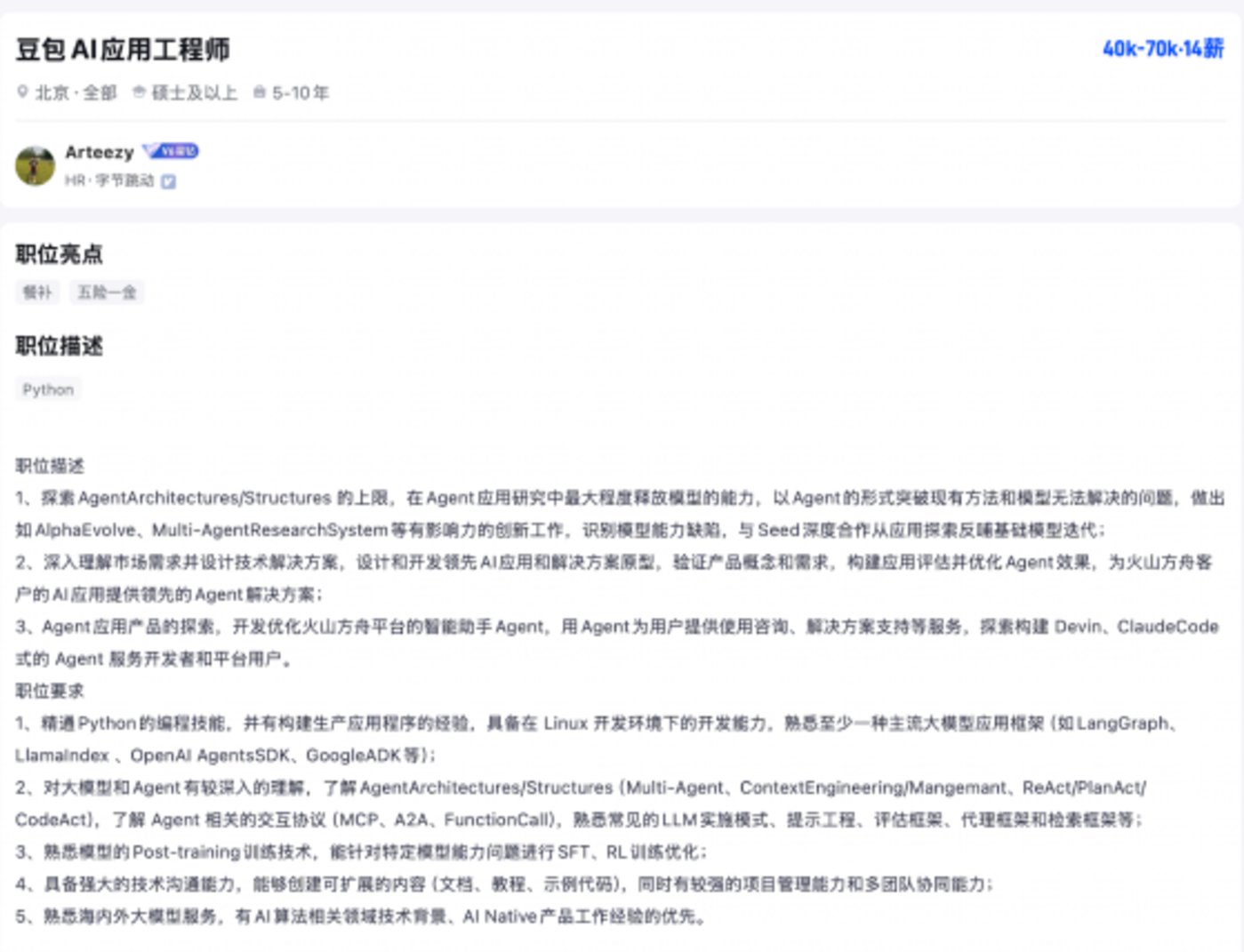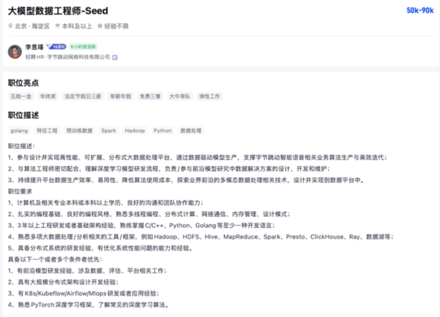 而字节跳动提供的薪资待遇,同样令不少人羡慕。招聘软件显示,字节跳动给予 「豆包 AI 应用工程师」 的月薪最高可达 7 万元,而 「Seed 大模型数据工程师」 最多可拿到 9 万/月的薪酬。