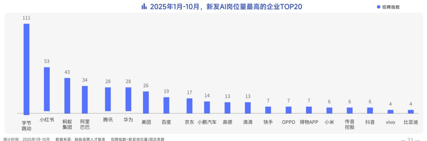 此外,据脉脉⾼聘人才智库今年 12 月发布的 《2025 年度人才迁徙报告》,在国内 AI 人才招聘方面,字节跳动一骑绝尘。