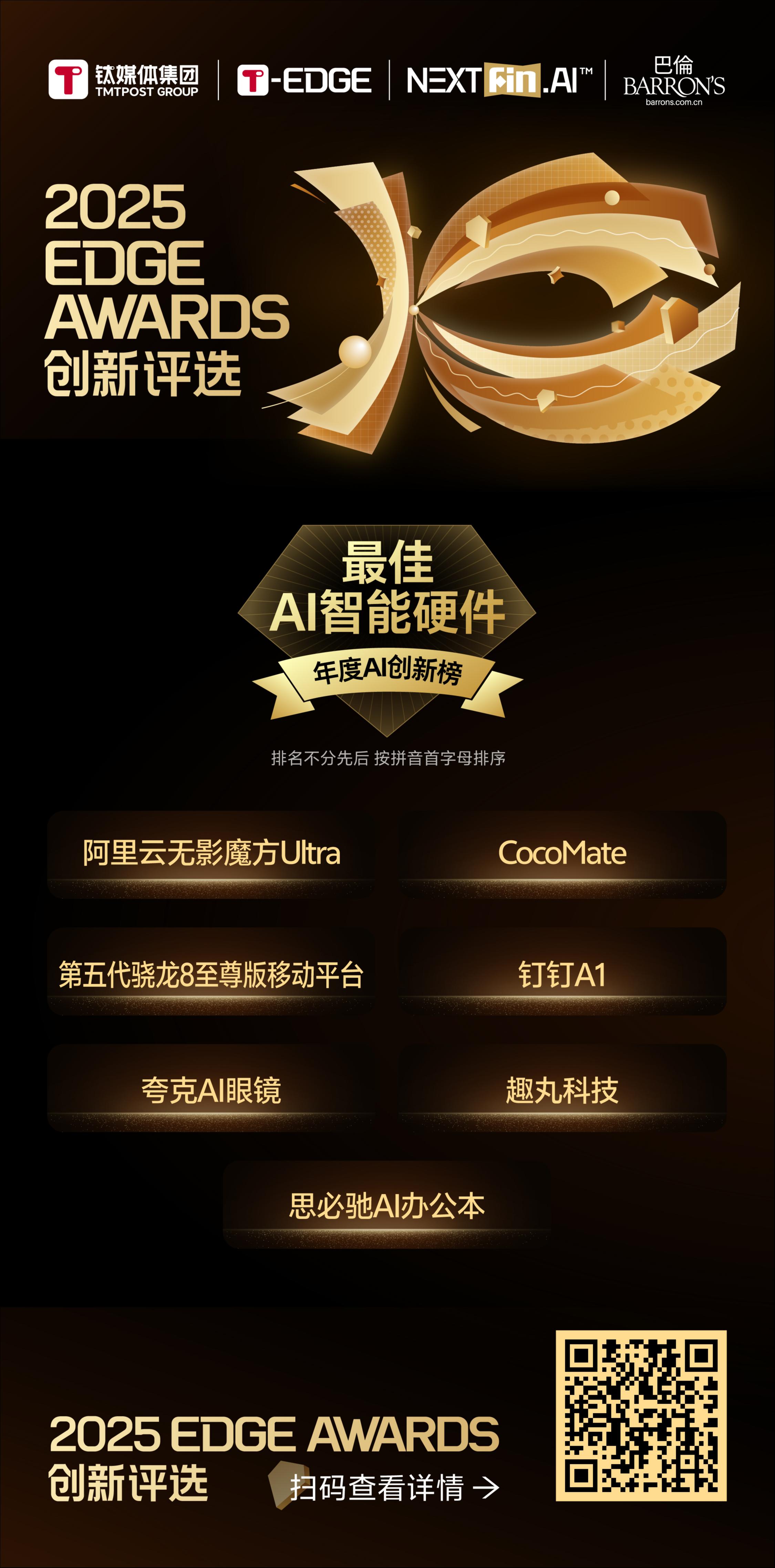 该奖项颁给将前沿 AI 能力与尖端硬件设计完美融合,为用户带来颠覆性体验的标杆产品。它们不仅是技术的集成,更是洞察的体现,通过精准的场景定义、流畅的自然交互与可靠的服务能力,真正让 AI 融入生活与工作,开创了智能硬件的全新范式。