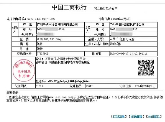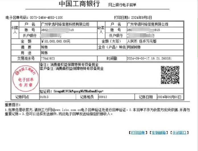 【TechWeb】9 月 6 日消息,辛选创始人辛巴晒出转账 1 亿元的网银电子回单截图,并表示:已经打给辛选小助理,静待三只羊成为有担当的销售企业。