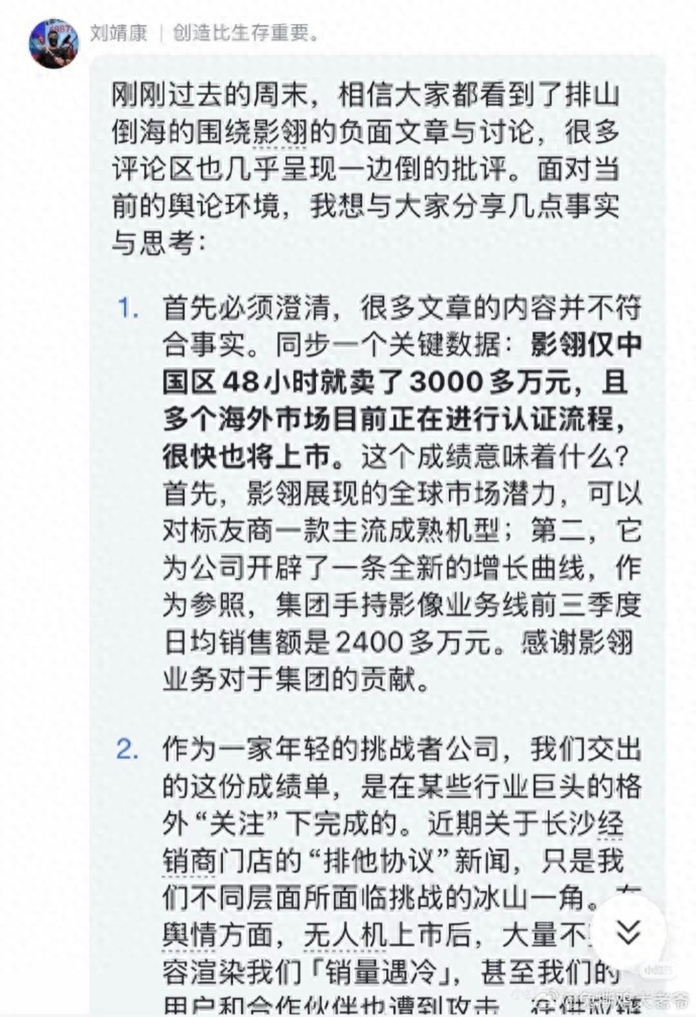 据刘靖康的内部信透露,影翎 A1 仅中国区 48 小时就卖了 3000 多万元 (按 6799 元的常规单价,粗略需要售出约 4400 台)。