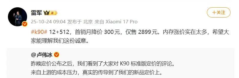 成本上涨导致利润空间被压缩的挑战最为严峻。雷军、卢伟冰等手机厂商的高管就曾在微博上“ 吐槽”,称 2025 年智能手机成本上涨幅度将会非常惊人。