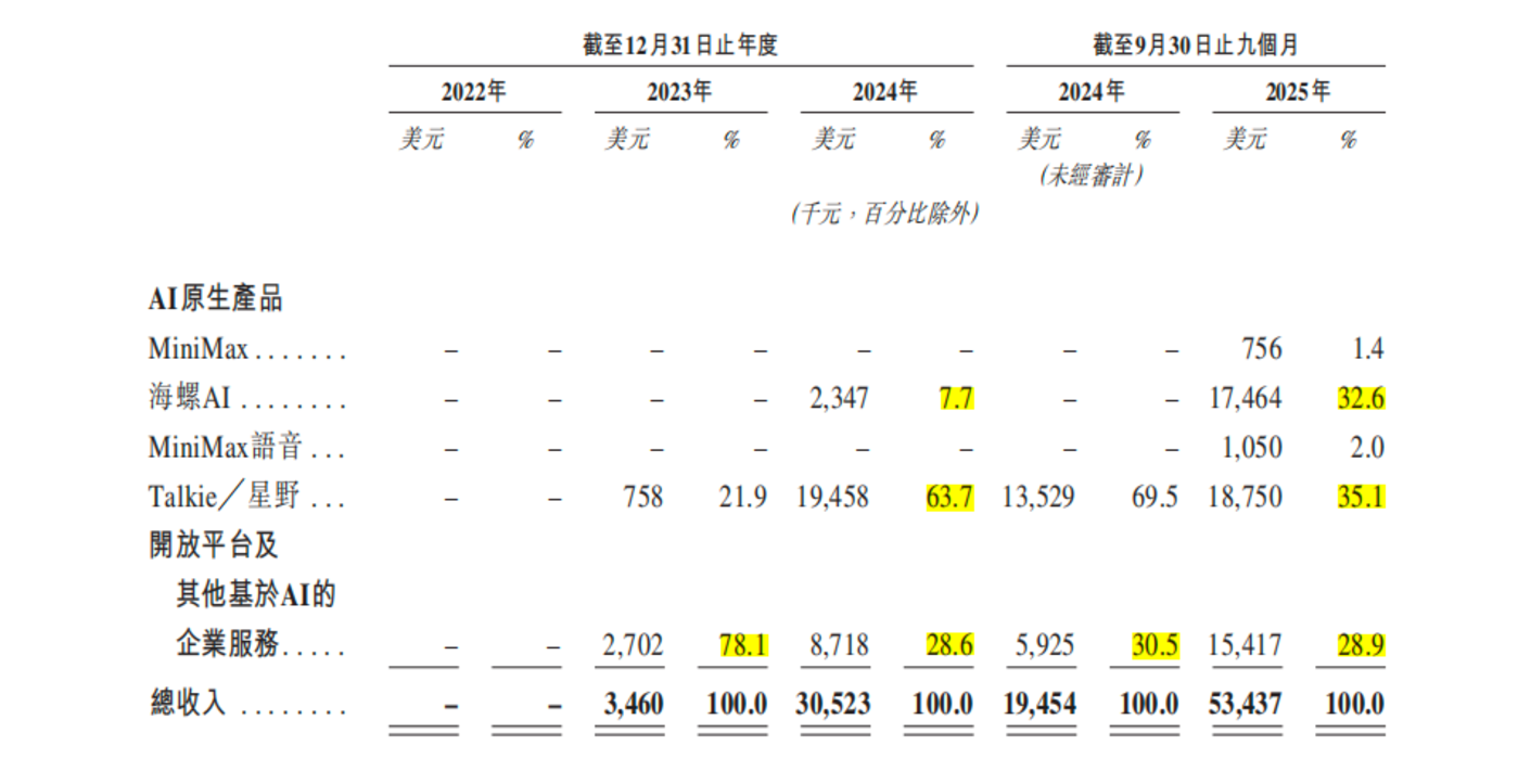 MiniMax 的收入增长则主要依靠 AI 原生产品,其中海螺 AI 的重要性在提升——收入占比从 2024 年的 7% 上升到 32.6%,而我们所熟知的 Talkie╱星野占比从 63.7% 下降到了 35.1%。