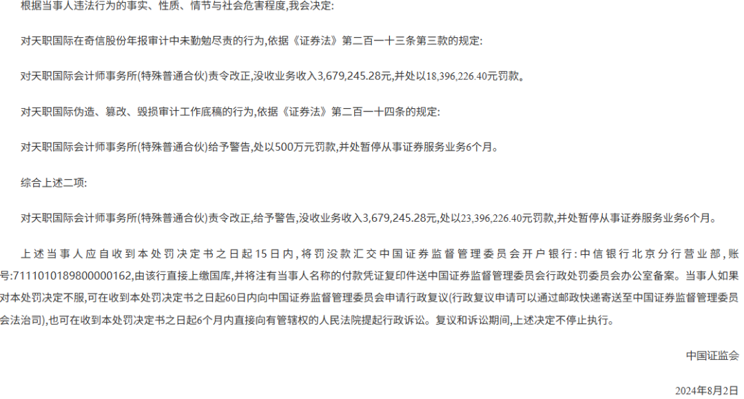 IPO 过程中,审计机构本质上是企业进入资本市场的“ 看门人” 角色。然而,作为英氏控股本次 IPO 的审计机构—— 天职国际会计师事务所 (简称“ 天职审计”),却因在奇信股份年报审计中出具虚假记载审计报告,并伪造、篡改、毁损审计工作底稿,于 2024 年 8 月被中国证监会处以罚没款约 2707 万元,并暂停从事证券服务业务 6 个月 (处罚期约从 2024 年 8 月至 2025 年 2 月)。