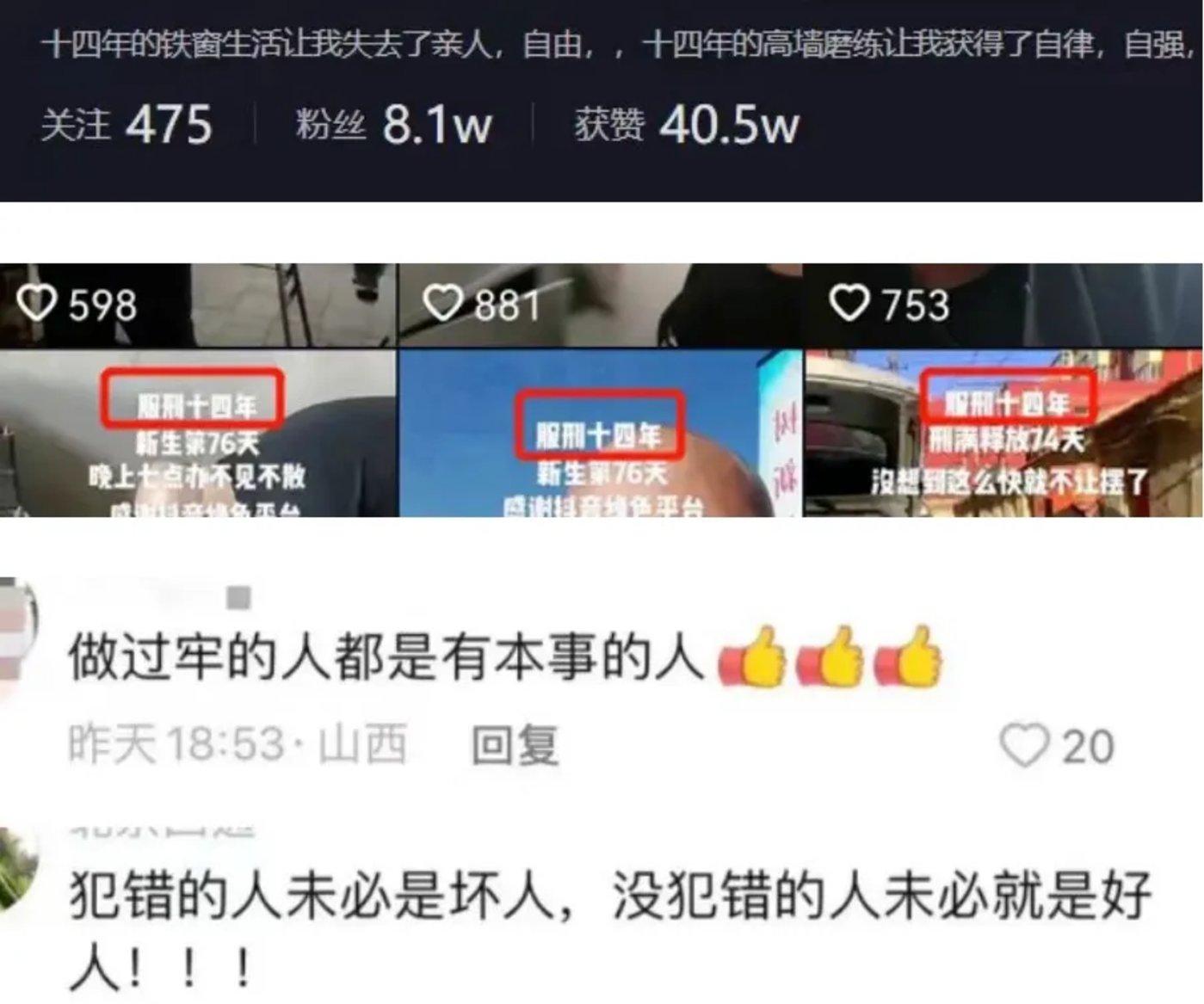 在互联网的喧嚣中,一种新的自媒体赛道——「进狱系」 博主悄然兴起,他们以曾经的服刑经历为卖点,通过精心包装的反差人设,迅速在网络上收获了大量关注和粉丝的共情,粉丝中不乏对其个人进行鼓励、对犯罪行为喊冤甚至赞扬、对博主进行真情告白的行为。这种看似 「人间自有真情在」 的 「大爱」 行为,实际上是对道德和法律的践踏,这些与 「进狱系」 博主共情的粉丝们,你们真的没事吗?