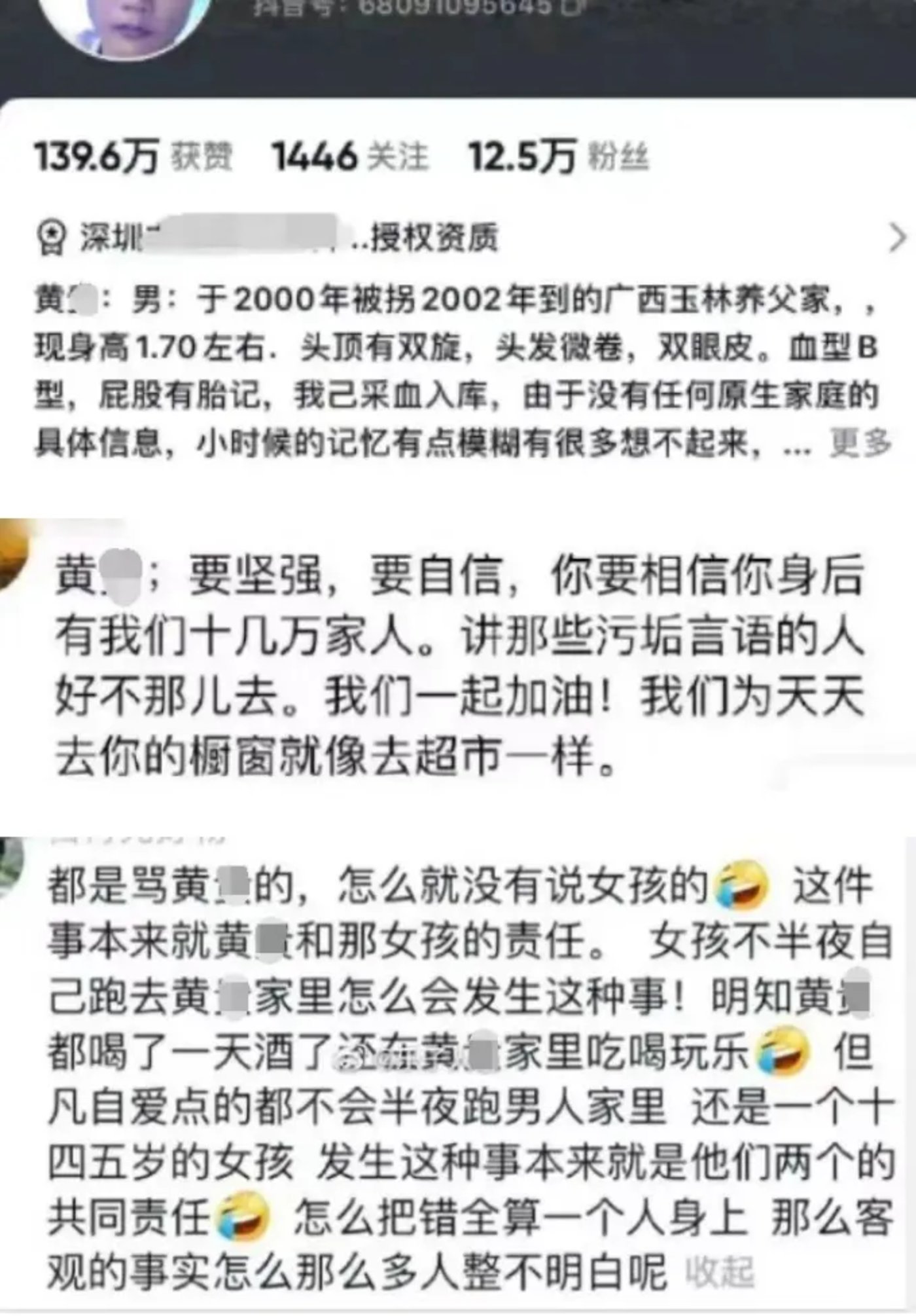 2022 年底,一个曾因 「持刀强奸」15 岁女孩而服刑的男子在某短视频平台爆火,收获了十几万粉丝。此人在其主页称自己曾被拐卖,现在想要寻亲,希望获得网友们的帮助。有网友晒出了该男子犯强奸罪的刑事判决书,但评论区仍然不少人站该男子,将其犯罪过往称为 「生活中的艰难困苦」,将对其的质疑称为 「污垢言语」,表示要跟博主 「一起加油」,甚至谴责受害人女孩有责任。收获众多粉丝之后,该男子开始直播带货,且以护肤品、卫生巾等女性用品为主,销量还不低,毕竟身后有十几万 「家人们」。