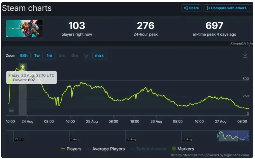 《星鸣特攻》 在 8 月 24 日正式推出后,截至目前,该游戏最高同时在线人数是 697 人,24 小时活跃玩家数是 100 多人。