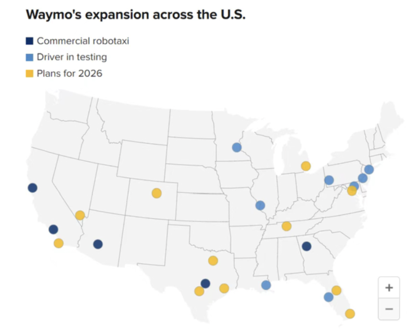 2025 年是 Waymo 业务扩张的 「爆发年」,无论是服务范围、订单数量还是全球化布局均取得突破。