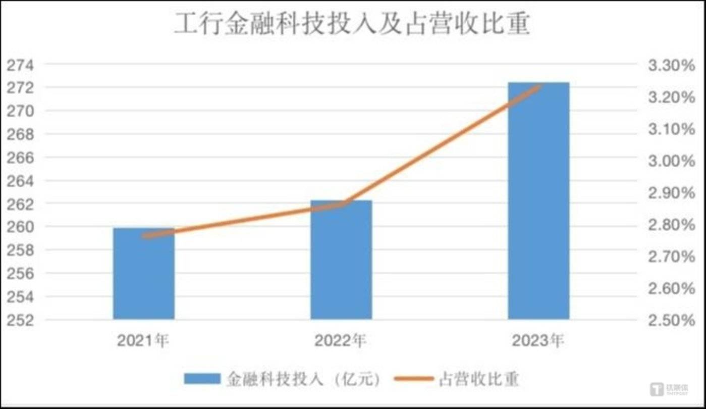 金融科技投入额度持续攀升。根据上市银行年报显示,六大行及股份制银行金融科技投入持续增长,六大行以工行最为突出,股份行以招行为代表,其中工行金融科技投入一直领先行业,2021 年、2022 年、2023 年,工行金融科技投入分别为 259.87 亿元、262.24 亿元、272.46 亿元,分别占营收 2.76%、2.86%、3.23%%。其中 2023 年金融科技投入较第二名建行高近 22 亿元。