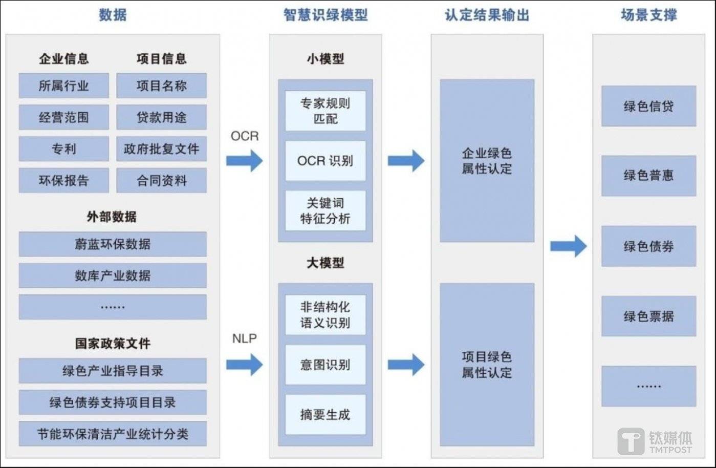在绿色金融方面,如何判断一个项目或企业的绿色属性是发展绿色金融的难点之一,对此,工行利用其数字技术构建了 「智慧识绿」 体系,该体系应用该企业或项目的内外部数据,如企业或项目的信息、所属行业、环保报告、贷款用途等内部信息,融合如蔚蓝环保数据、数库产业数据等外部信息及绿色产业指导目录等国家政策文件,通过 OCR、NLP 等技术构建智慧识绿小模型、大模型来判断绿色企业或项目等认定,并将认定结果应用于绿色信贷、绿色债券等多个绿色金融场景。
