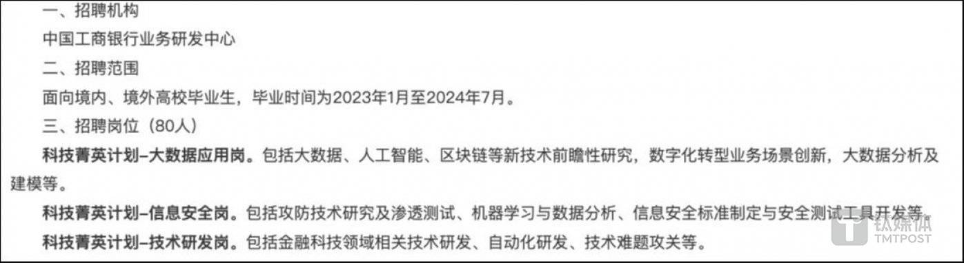 科技人员扩张之路并未停止。比如,上半年,工行业务研发中心发布 2024 年度春季校园招聘公告,公告显示该行科技菁英计划就大数据应用岗、信息安全岗、技术研发岗招聘 80 人,其中大数据应用岗包括大数据、人工智能、区块链等新技术前瞻性研究,数字化转型业务场景创新,大数据分析及建模等;信息安全岗包括攻防技术研究及渗透测试、机器学习与数据分析、信息安全标准制定与安全测试工具开发等;技术研发岗包括金融科技领域相关技术研发、自动化研发、技术难题攻关等。