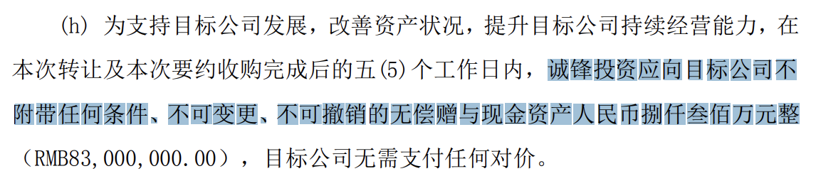 看点三,该笔交易中还出现了罕见的无偿捐赠承诺,即锋龙股份的原控股股东要在要交易完成后向上市公司无偿捐赠 8300 万元,用于支持公司发展、改善资产状况。