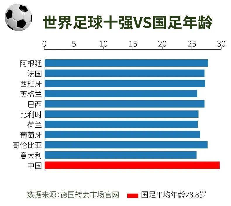 如果把目光放得更宽一些,对比世界排名前十的国家队,更能看出国足的 「老化」。世界排名前十的球队,没有任何一支球队的平均年龄超过 27 岁,普遍在 25、26 岁。