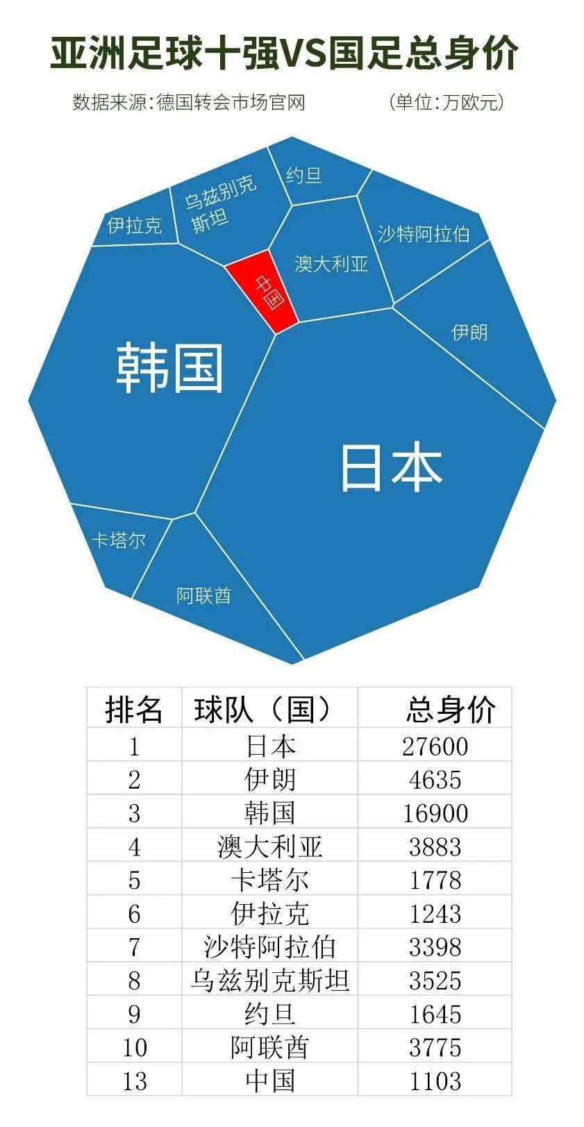 据足球转会网站 「德转」 数据,中国男足国家队的总身价为 1103 万欧元,其中身价最高的是前锋武磊,120 万欧元。而亚洲身价最高的球员是日本队的久保健英,达到 5000 万欧元,一个人的身价就是国足 27 人的 4.5 倍。而日本全队的身价是 2.76 亿欧元,是国足身价的 25 倍。