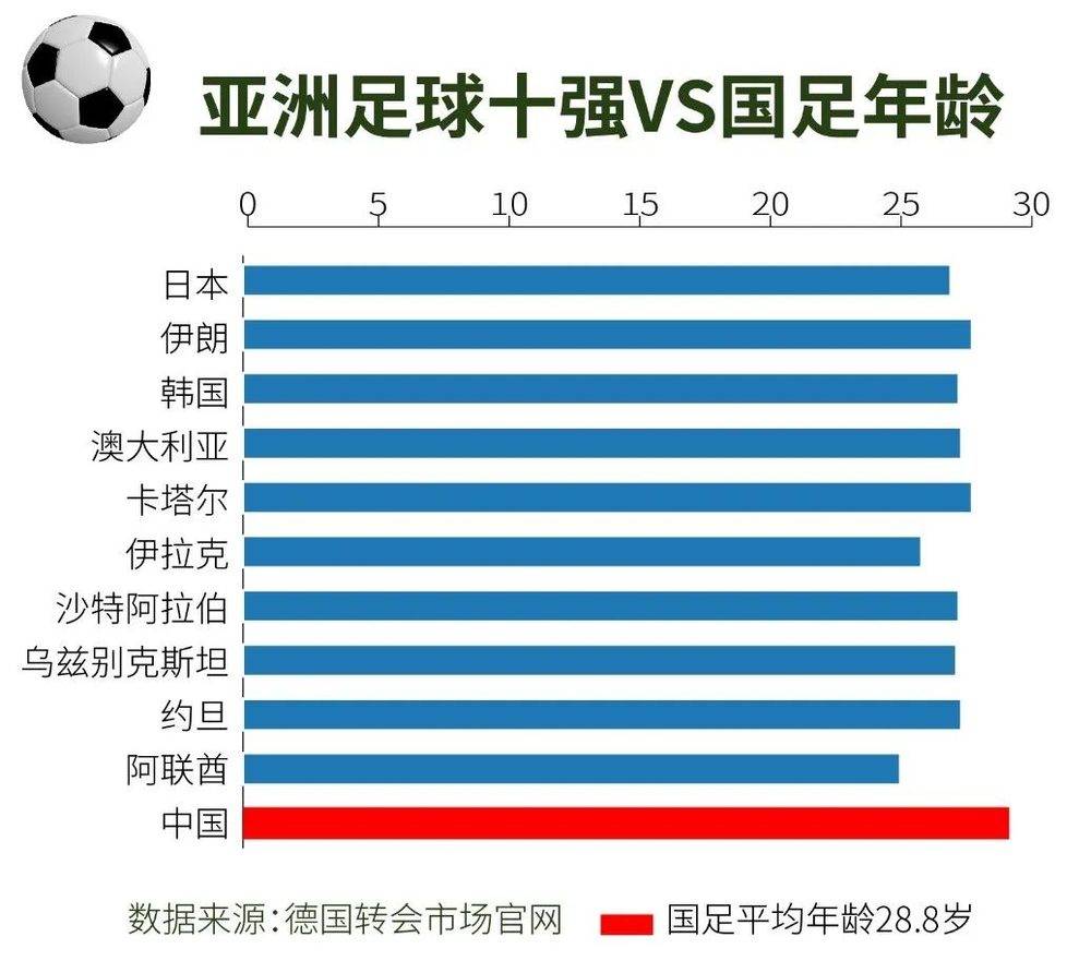 相比之下,虽然已经过一轮 「年轻化」,国足仍然呈现出 「老态」。