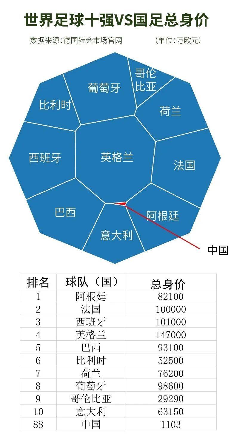 获得欧洲杯亚军的英格兰队,球星数量最多,27 人总身价 14.7 亿欧元,排名世界第一,是国足的 133 倍。年仅 21 岁的贝林厄姆,一个人身价就达到 1.8 亿欧元,与法国的姆巴佩、挪威的哈兰德、巴西的维尼修斯并列世界第一,贝林厄姆一个人身价,是国足 27 人总身价的 16 倍。巨大的身价背后,体现的是巨大的差距。