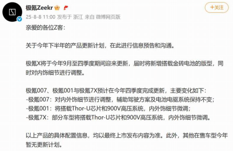 比如,早在 8 月上旬,极氪就公布了年度产品更新计划,提前向消费者做了一次透明预告,宣布了极氪 X、极氪 007、极氪 001、极氪 7X 等已发布车型的更新计划—— 与此同时,针对现款车型,则给予更加优惠的购车政策。