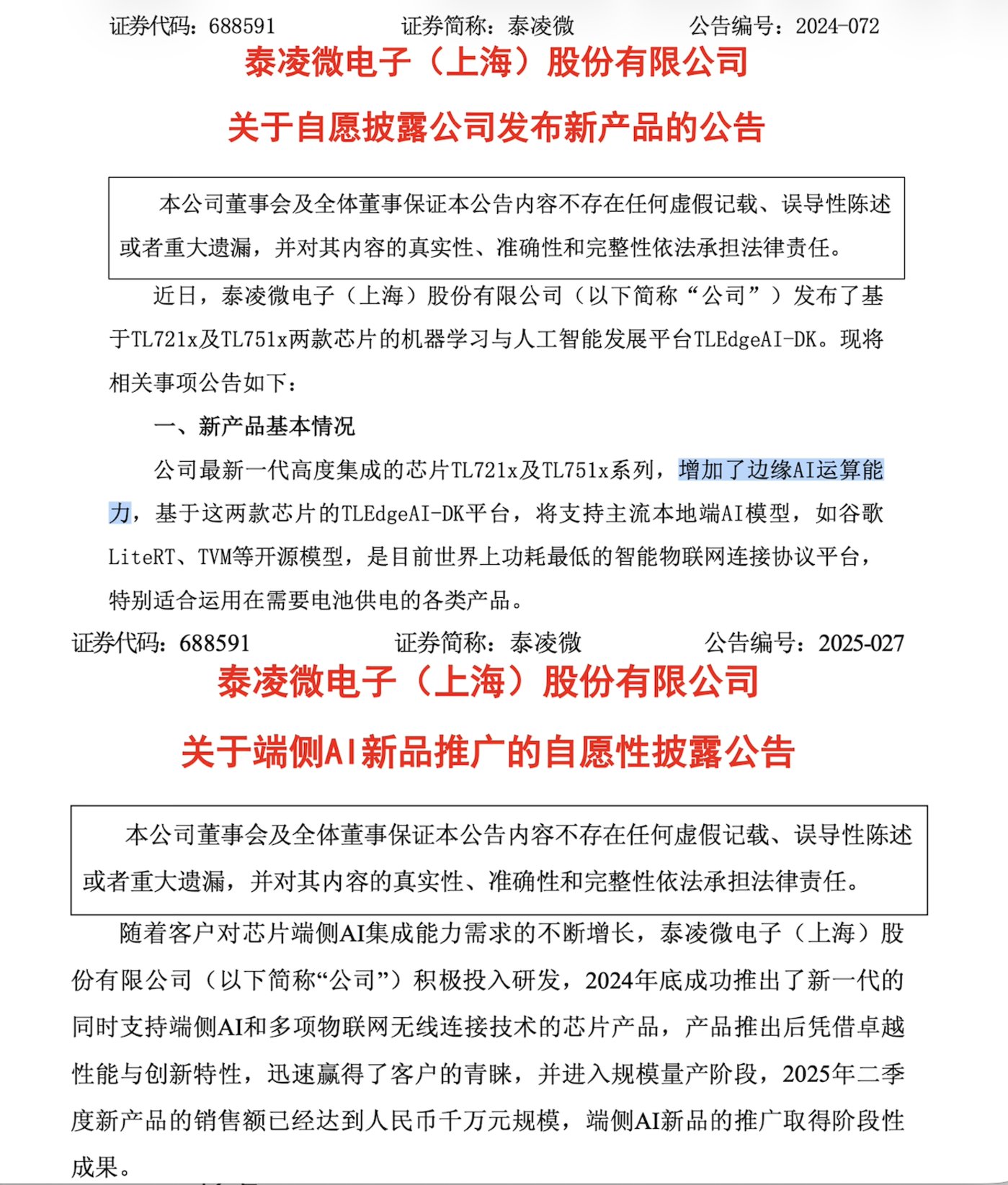 2025 年 6 月 24 日, 泰凌微又发布一份 《关于端侧 AI 新品推广的自愿性披露公告》,这份公告中最显著的高频词就是——「端侧 AI」。 鉴于其端侧 AI 芯片产品二季度销售额达千万规模,公司正式宣告:「端侧 AI 新品的推广取得阶段性成果。」