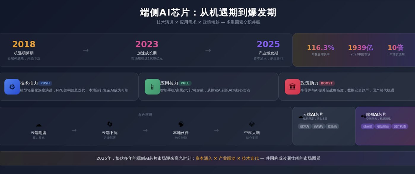 2018 年,端侧 AI 芯片是一个充满机遇的新兴领域,2025 年,已演变为热浪滚滚的产业大爆发。过程背后并非单一因素驱动的线性发展,而是一个由技术演进、应用需求爆发、宏观政策倾斜等多重因素交织共振的复杂过程。
