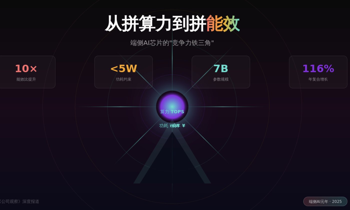与云端 AI 芯片主要拼算力不同,端侧 AI 拼的是效能。因为在 AI 应用向边端迁移 (自动驾驶、AIoT、可穿戴) 情况下,传统数据中心的高功耗模式根本无法持续。边缘设备面临续航、散热、体积的铁三角约束,要求 AI 推理必须具备极致的能效比。