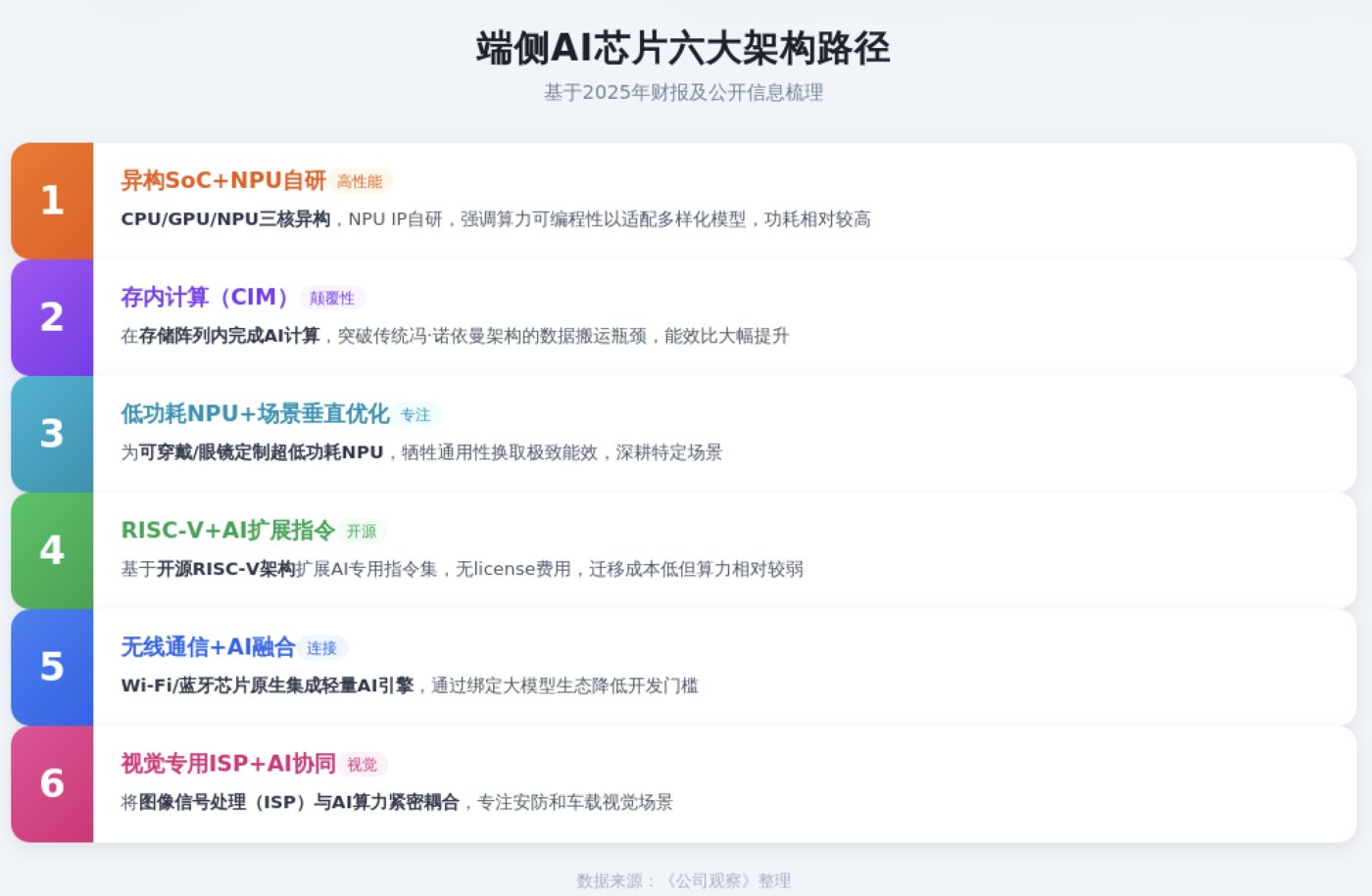 基于 2025 年财报及公开信息梳理,《公司观察》 发现当前主要存在六大架构路径。这六大路线各有代表性玩家,目前均有生存空间,不过,据估计 5 年内也将从格局分化逐渐过渡到收敛整合。这个过程中,昔日 「当红」 的一些传统安防芯片龙头厂商在端侧 AI 赛道上渐显落寞。