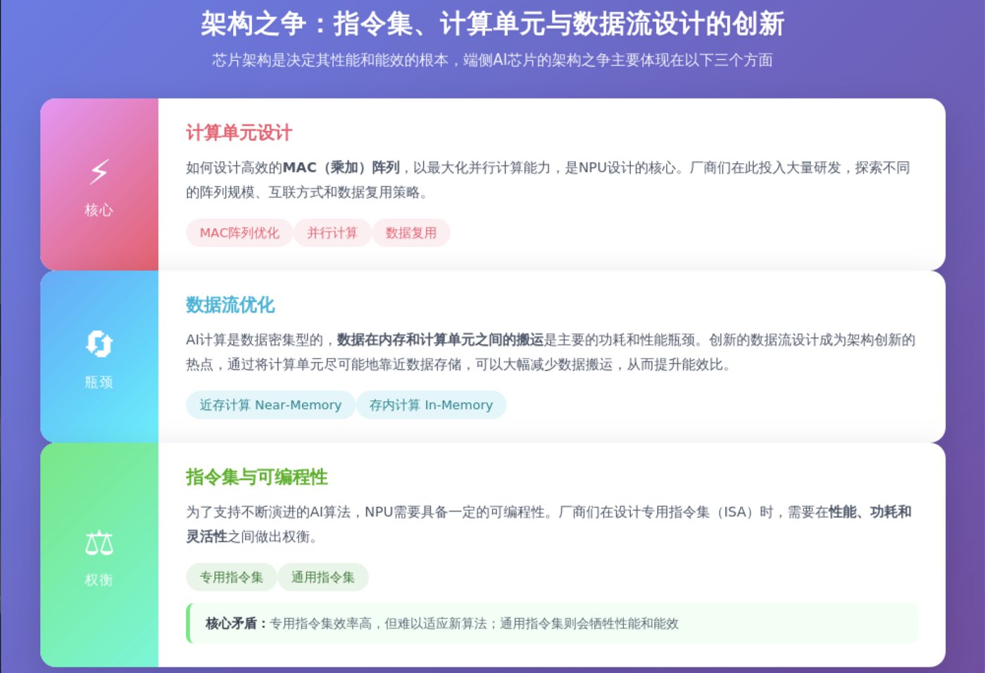 「芯片设计牵扯到非常多各个方面的技术,但架构设计确实是大家的核心竞争力之一。」 芯片定制头部厂商灿芯股份相关人士称。从竞争焦点的迁移可以清晰看到这一趋势:2023 至 2024 年,市场关注的是 「芯片是否集成 NPU」;到了 2025 年,问题已升级为 「NPU 怎么设计、存算如何融合、功耗如何优化」 的架构细节比拼。
