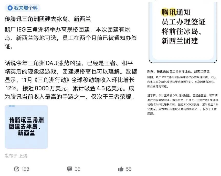前些天,网传 《三角洲行动》(以下简称“《三角洲》”) 员工去冰岛、新西兰团建的消息羡煞众多打工人。