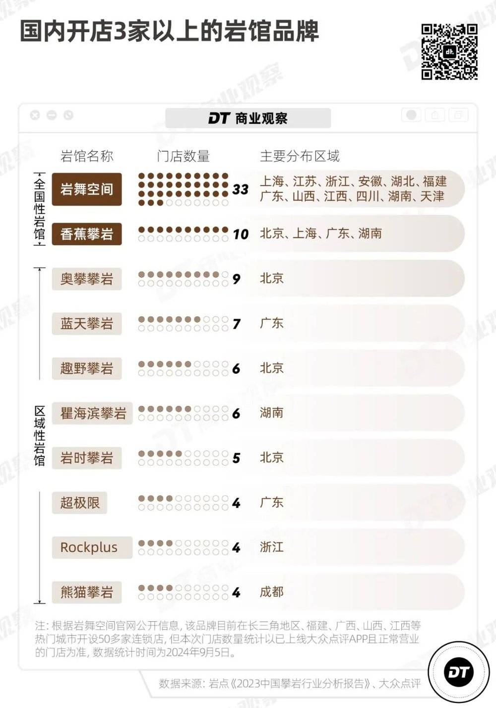 根据我们在大众点评上的统计,目前国内有 10 家连锁门店以上的全国性岩馆只有两家:岩舞空间、香蕉攀岩。其余则比较零散,且基本集中在一线、新一线和二线城市中。