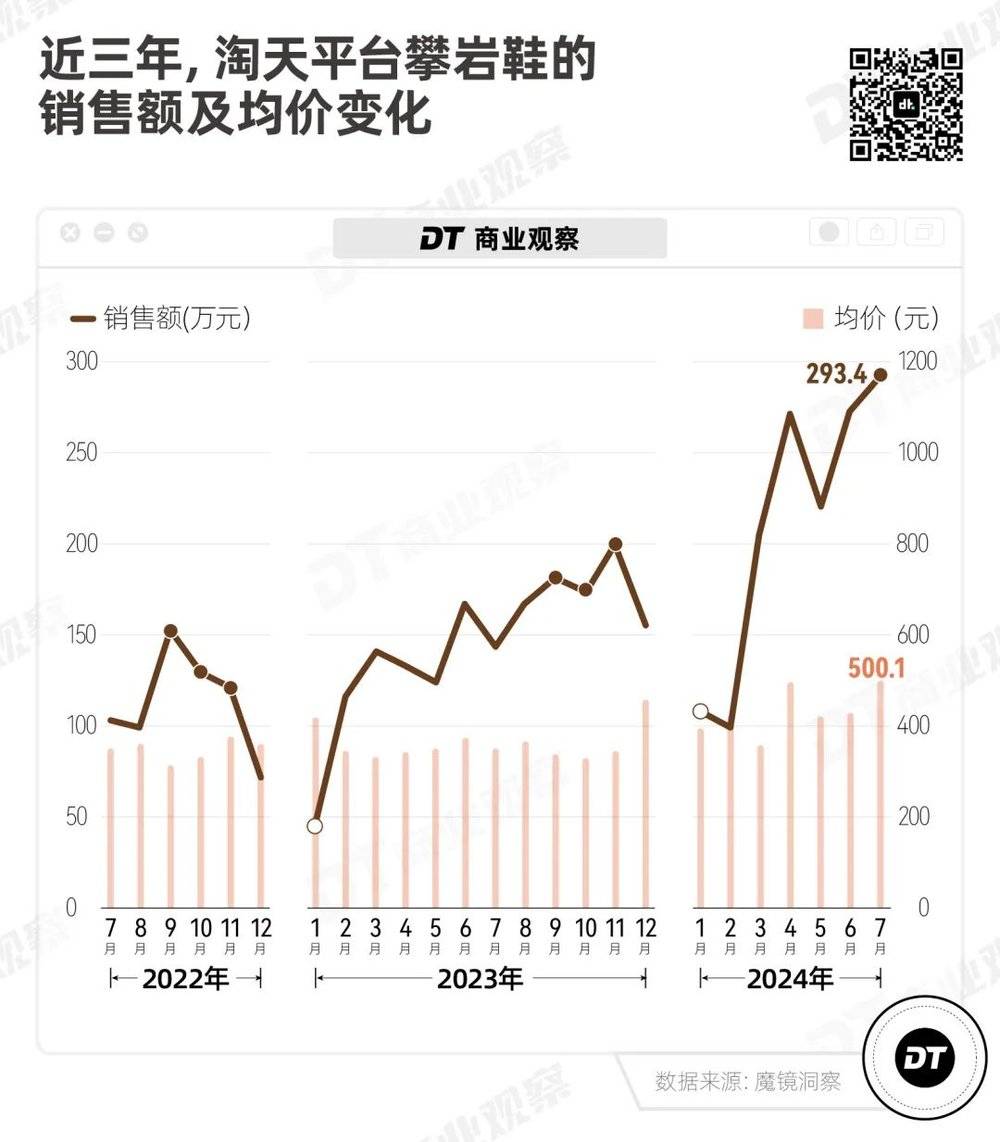 以攀岩鞋为例,魔镜洞察显示,每年的 1 月前后是攀岩鞋销售的季节性低谷,9 月开始的秋季则会迎来高峰。但今年 6、7 月的销售额已经追平甚至超过 2023 年的销售额峰值,除了因为均价上涨,奥运会也功不可没。