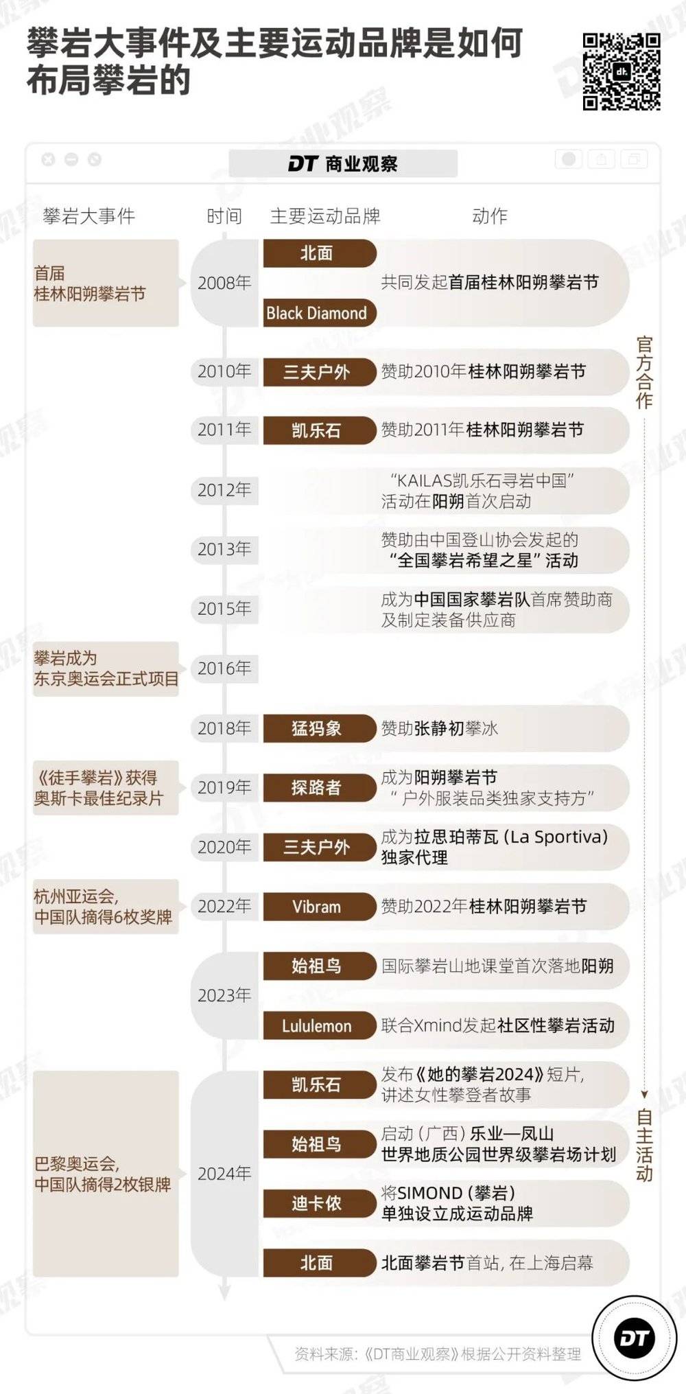 值得一提的是,除了线下岩馆,运动户外品牌也在不断加码攀岩这个细分赛道。最早在 2008-2011 年,北面、Black Diamond、三夫户外、凯乐石就分别联合发起、赞助桂林阳朔攀岩节。