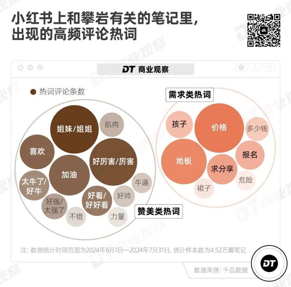 根据千瓜数据,7 月,攀岩相关笔记在小红书互动总量 218.1 万。但仅 8 月 5 日-8 月 11 日这一周,相关笔记的互动量就有 224.1 万。伍鹏攀岩视频的评论区,成了大家讨论和欢呼的热门打卡地。