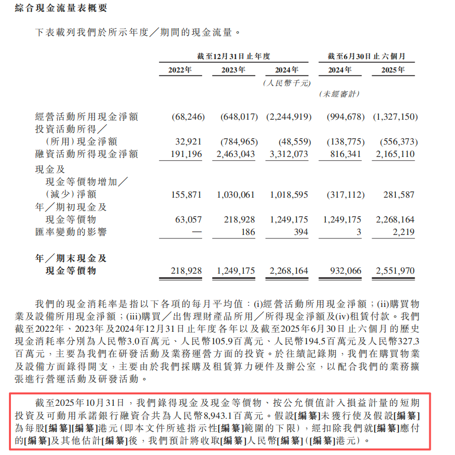 但有人认为上述算法比较粗暴:一是忽略了智谱的营收收益补充,二是忽略了招股书中补充的最新财务信息—— 综合现金流表下方的一段补充性文字:截至 2025 年 10 月 31 日,我们录得现金及现金等价物、按公允价值计入损益计量的短期投资及可动用承诺银行融资合共为人民币 8,943.1 百万元。