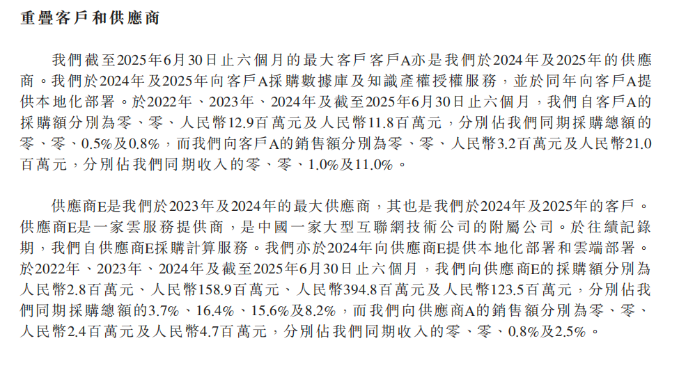 另一方面,智谱的大单存在“ 客户为虚,供应商为实” 的嫌疑。在招股书中不少大客户同时是智谱的大供应商,但客户 A、P、Q 都出现了采购额超过销售额的情况,比如,智谱在 2022 年至 2025 年上半年期间,向最大客户 A 销售了 2.42 亿元,但却向客户采购了 2.47 亿元。
