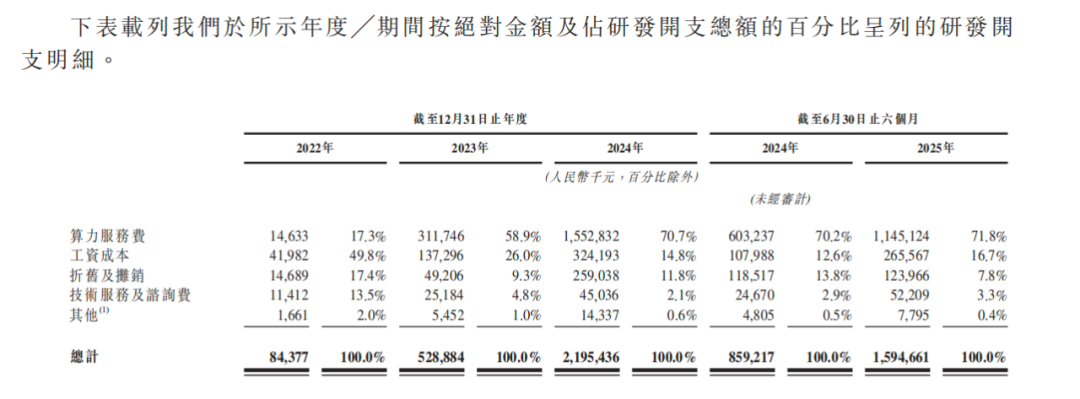 其中,“ 算力服务费”(包括模型训练以及通过云端部署为客户提供服务) 从 2022 年的 0.15 亿元到 2025 年上半年的 11.45 亿,三年时间飙升到七成以上,并且这些研发成本,均被作为成本损耗计算,“ 并无将任何研发开支资本化”。