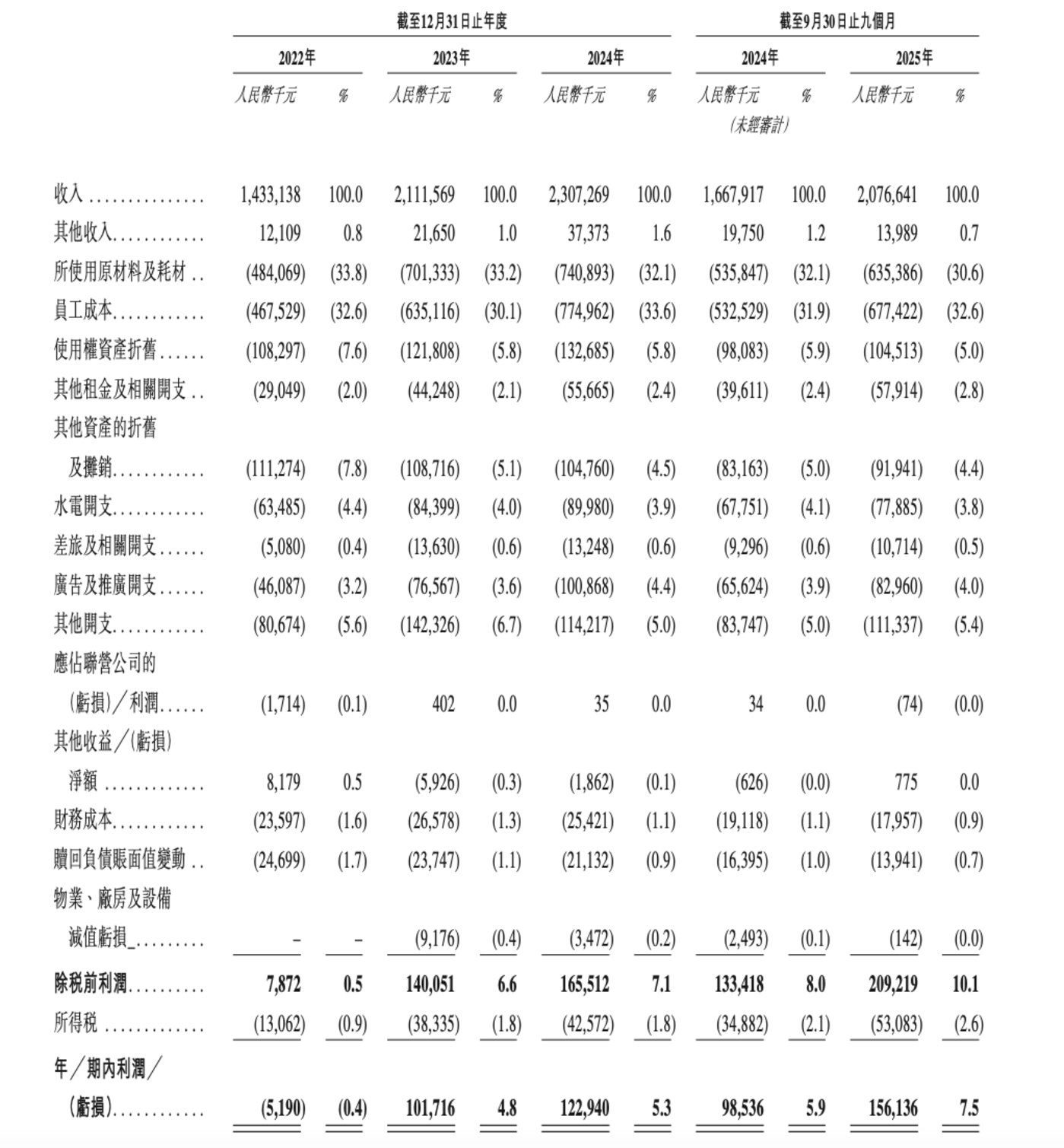 数据显示,2022 年到 2024 年,原材料及耗材,占收入的比例为 33.8%、33.2%、32.1%,在 2025 年前三季度,再降至 30.6%,为近年来的低点。
