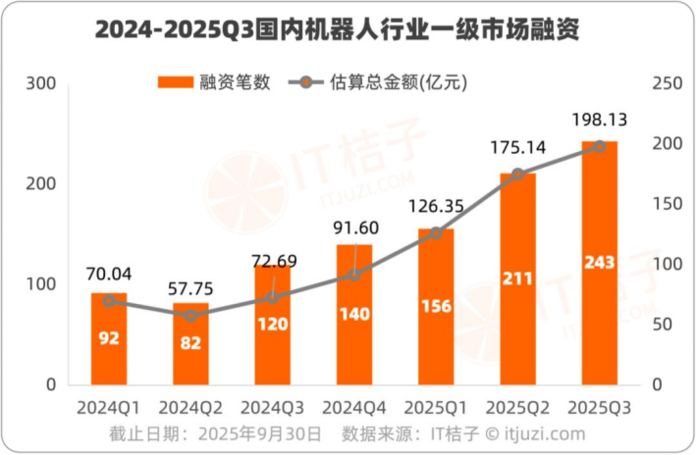 据 IT 桔子统计,2025 年前三季度,国内机器人行业融资事件达到了 610 笔,较去年同期翻倍增长。进入下半年以来,融资事件更呈现加速增长的态势,仅第三季度就有 243 笔。