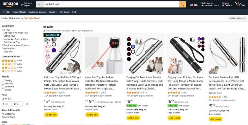 陈子豪卖一款红外线激光灯,逗猫用的。一款批发价一两块的激光笔,贴上 「猫」 的标签,再出海,就能身价翻倍。据查询,这种简易版的红外线激光笔,在 1688 上批发价最低在 1.5 元,在拼多多上单价在 2-10 元,在亚马逊上售价在 6-10 美元,精致一些的逗猫用激光笔在 Temu(拼多多海外版) 加拿大站上可售 30 加币。
