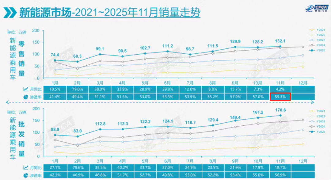 不止是充电站附近电车扎堆,丁骁勇明显感受到了近两年路上跑的电车是一辆接着一辆。事实确实如此,2025 年 11 月,我国新能源汽车零售渗透率历史性地接近 60% 大关。这意味着每卖出 10 辆车,就有 6 辆是绿牌车。