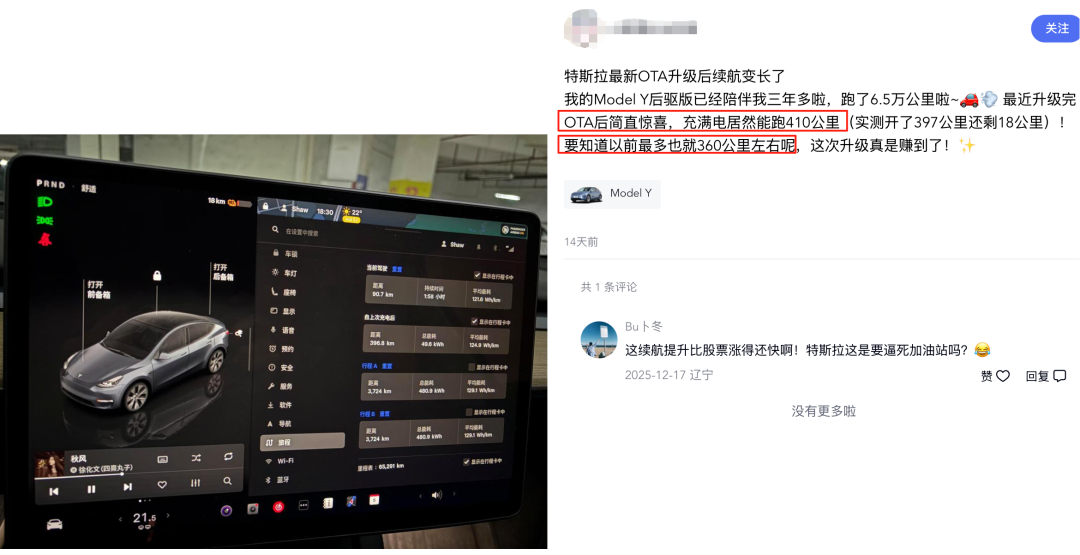 图/某特斯拉车主分享 OTA 升级后续航增加 来源/互联网 新能源观截图