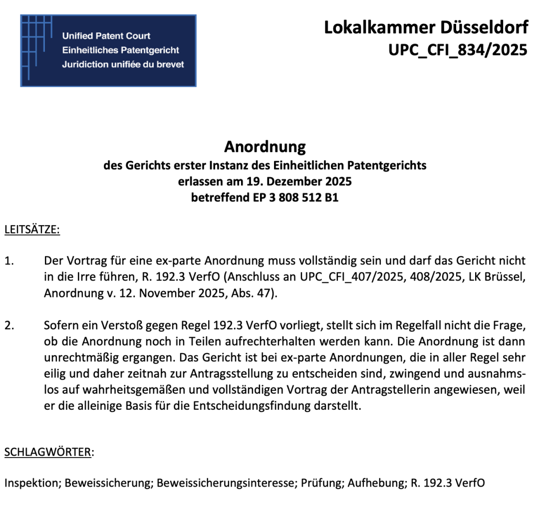最终结果是,2025 年 12 月 19 日 UPC 杜塞尔多夫地方分院作出裁定,认定原命令是基于“ 违法作出的”,因此撤销了该单方证据保全命令。