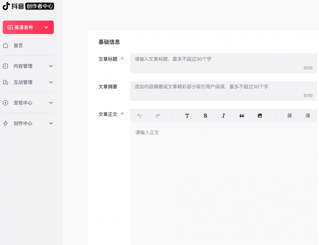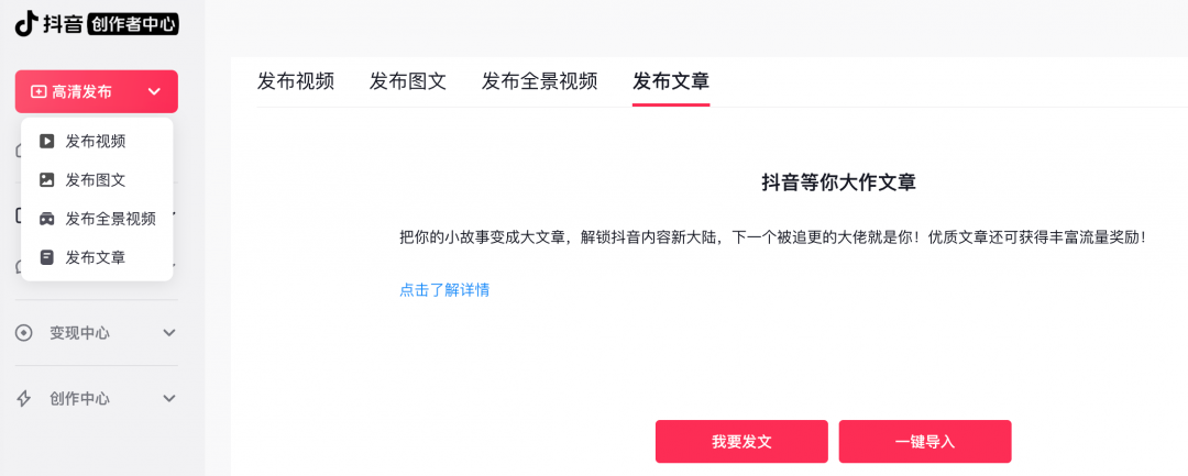 用户进入抖音创作者中心电脑 (PC) 端,选择 「高清发布-发布文章」,即可发布长图文。在手机端也已有发长文功能。