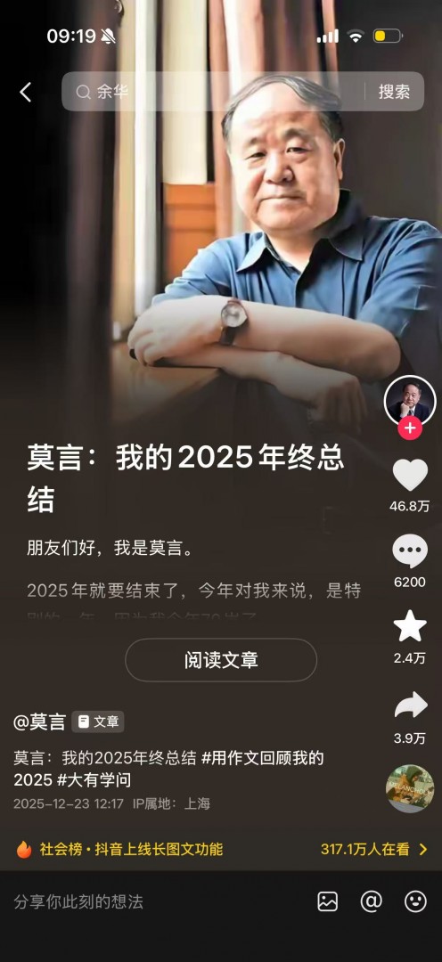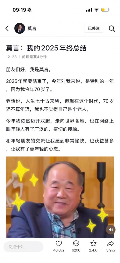 知名作家莫言率先体验了该功能,发布年度总结文章,以亲切笔触分享生活感悟,吸引大量用户互动。