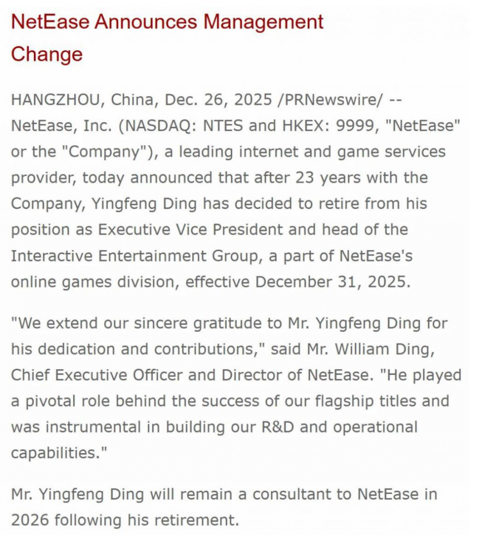 【TechWeb】12 月 27 日消息,网易发布公告称,网易集团执行副总裁、网易互动娱乐事业部负责人丁迎峰将结束其在网易 23 年的任职,于 2025 年 12 月 31 日正式退休。退休后,他将继续担任公司顾问职务。