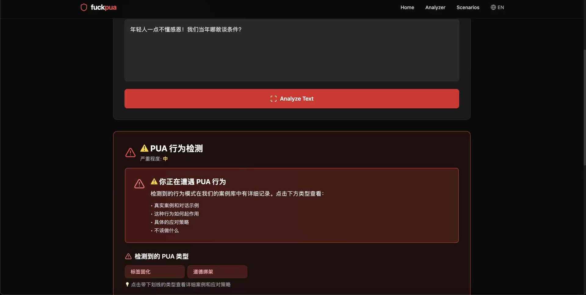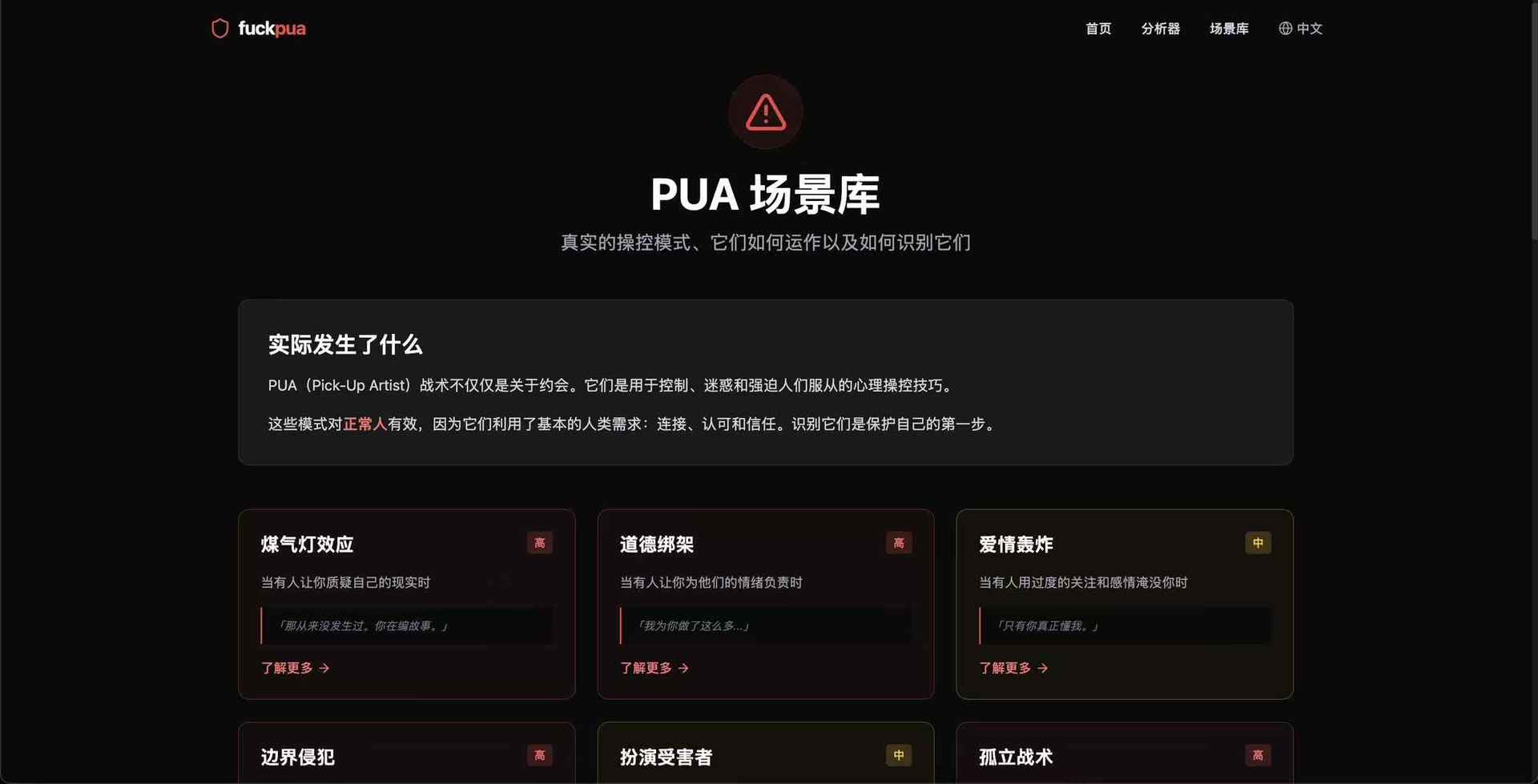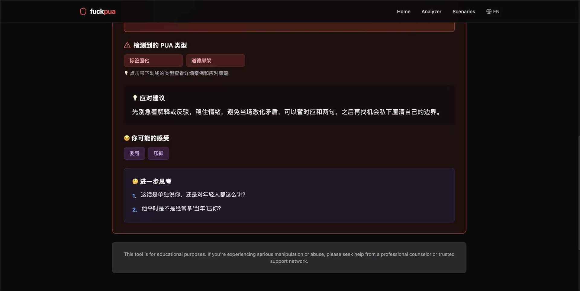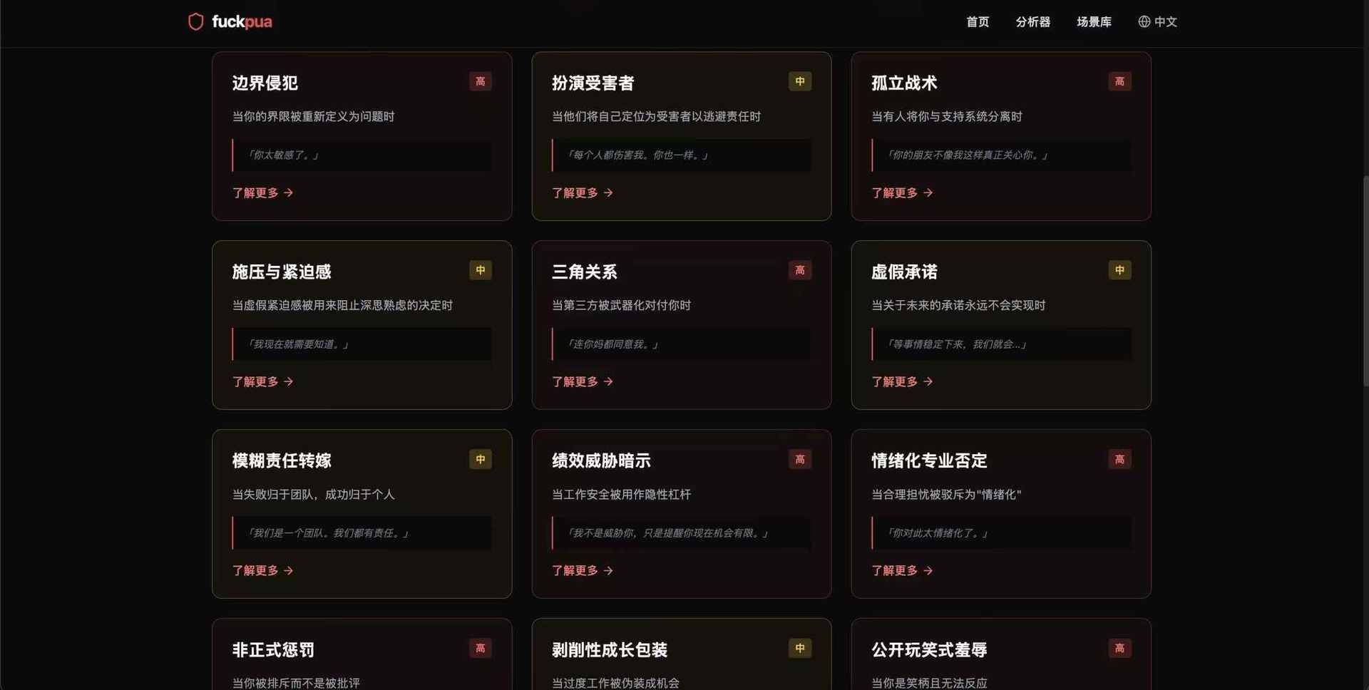 其实我们这一生一直在被 pua。小时候,大人常见的是 「别人家的孩子都能做到,你怎么不行」,长大了,劝你 「忍一忍也是为你好」,到了学校和工作里,领导说 「我对你期望很高,所以才要求严格」,恋爱了,对象说 「如果你真的在乎我,就不会这样想」,然后开始为了证明自己而一次次退让。我越来越清楚:这些测试本就不该通过。我深恶痛绝,于是做了一个反 PUA 的免费网站,能检测你是否正在经历 pua,pua 的类型是什么,让更多人识别原理 pua,如果给我一次再来一次的机会,我希望所有的测试都没通过。人生应该自己掌握 地址:https://www.saynopua.com/