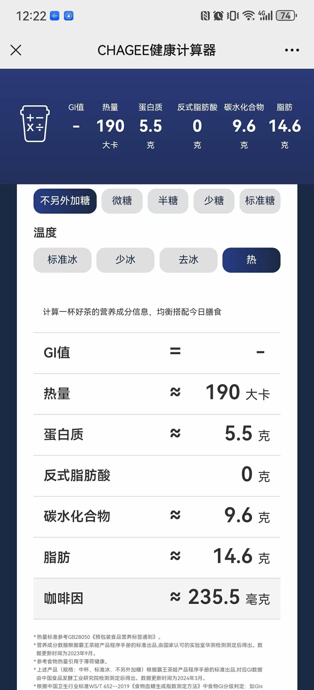 霸王茶姬也推出了查询服务,可以在公众号获取每款产品的营养标识信息,其中就包括咖啡因。