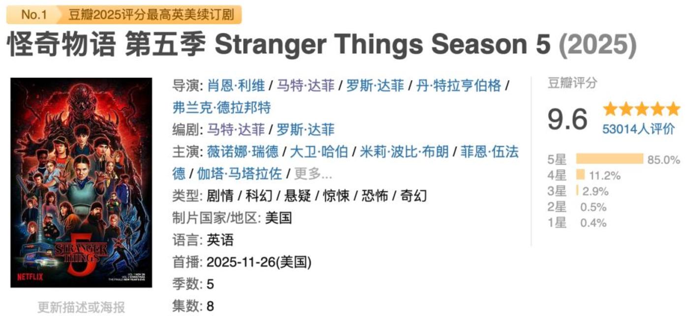 △ 《怪奇物语 5》 拿下豆瓣 2025 年评分最高英美续订剧榜首