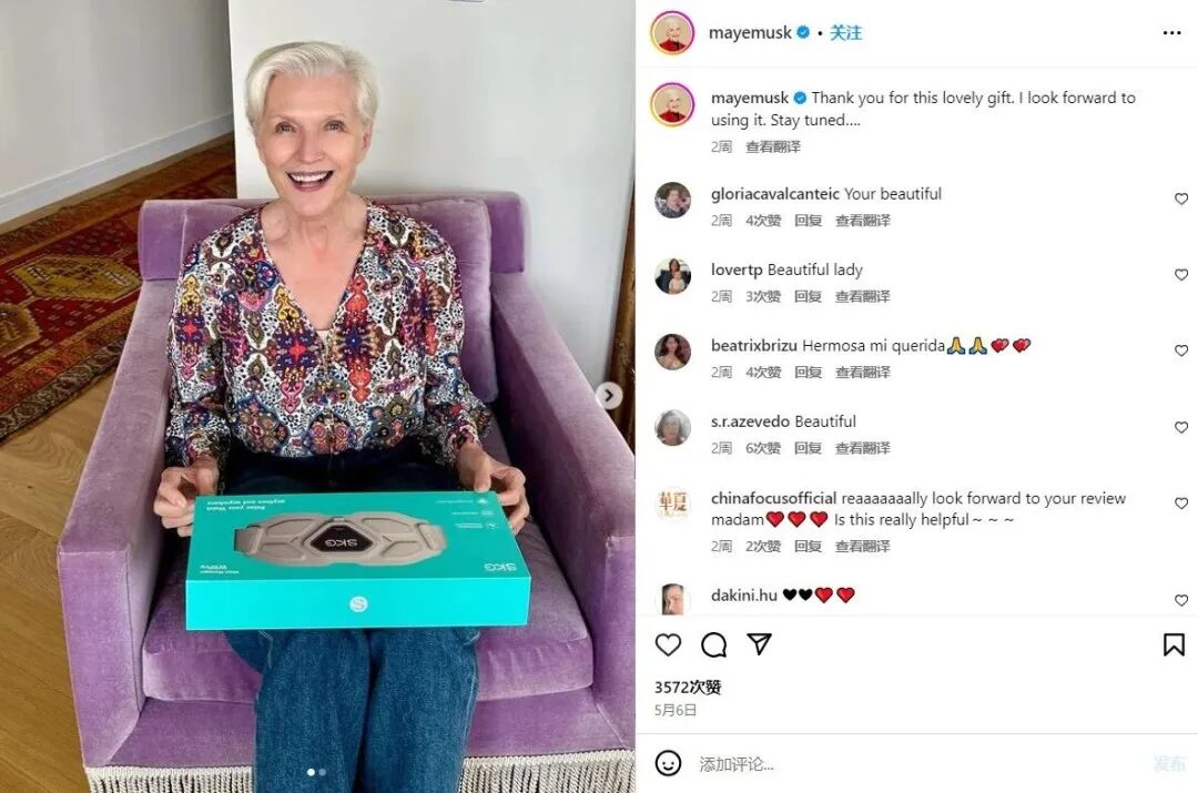 面对国内市场激烈的竞争,SKG 也开始发力海外,并用其最擅长的“ 明星效应” 率先打头阵。2024 年,SKG 签约埃隆· 马斯克的母亲—— 梅耶· 马斯克,担任全球健康大使,在“ 国产按摩仪火到首富家”“ 马斯克妈妈的母亲节礼物” 等话题下,SKG 试图再度在全球市场复制“ 网红产品效应”。