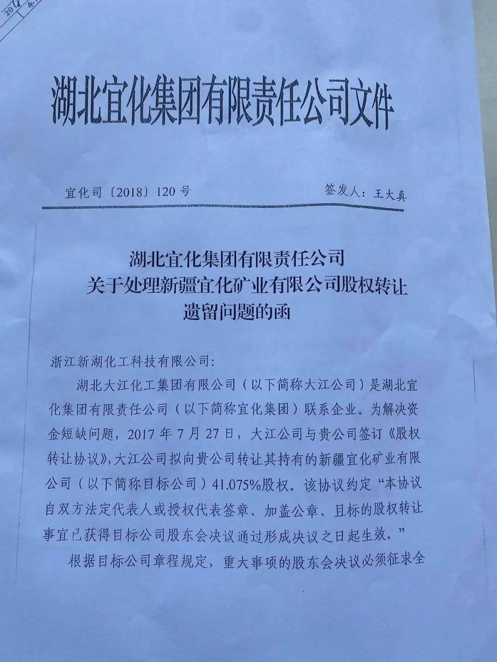 图片来源:湖北宜化集团关于处理新疆宜矿股权转让遗留问题的函