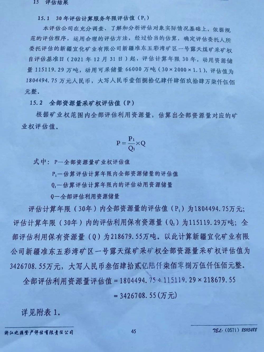 评估机构浙江之源资产评估有限公司 2022 年 4 月出具的一份采矿权评估报告书,对新疆宜矿拥有的五彩湾矿区一号露天煤矿采矿权进行了评估,矿区面积 44.844 平方公里,自评估基准日 (2021 年 12 月 31 日)起,评估计算年限 30 年,全部资源量采矿权评估值为 342.67 亿元。