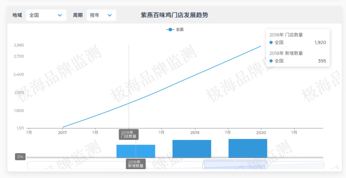 凭借着这种经销模式,紫燕食品一度实现迅猛扩张。极海品牌监测数据显示,2018 年,紫燕门店数量尚不足 2000 家。而据公司官网披露数据,到 2023 年末,紫燕门店数量在短短几年时间内已攀升至 6205 家。